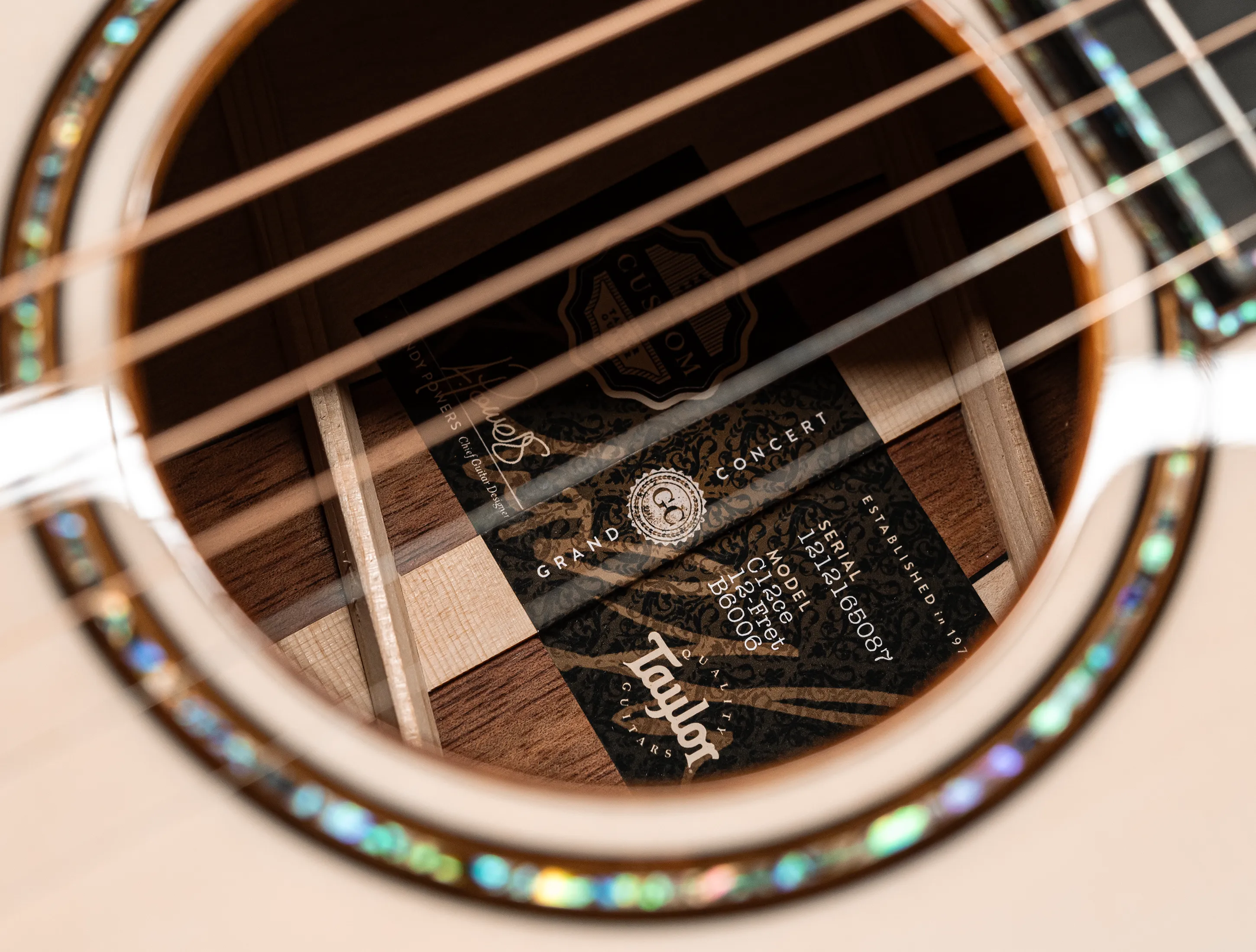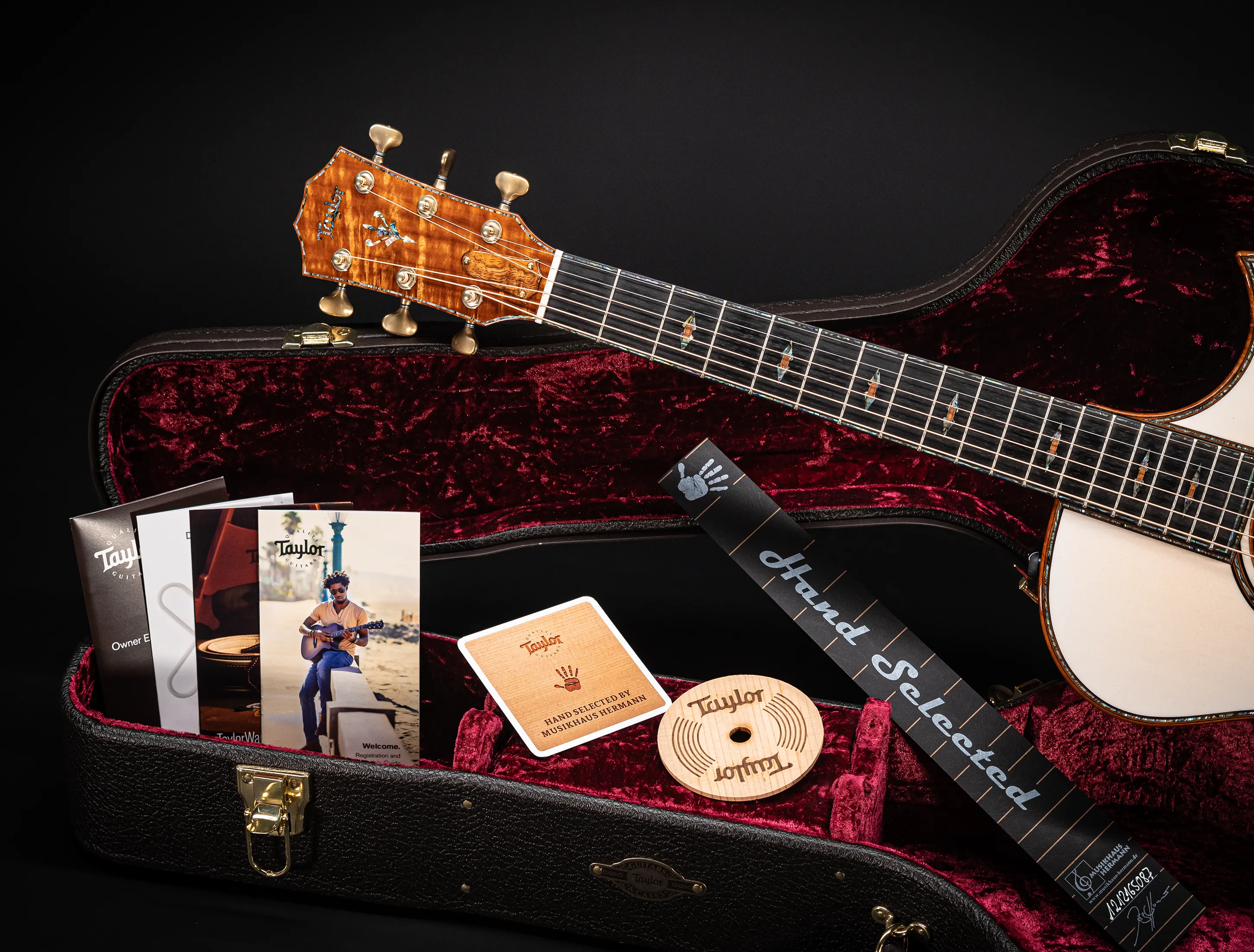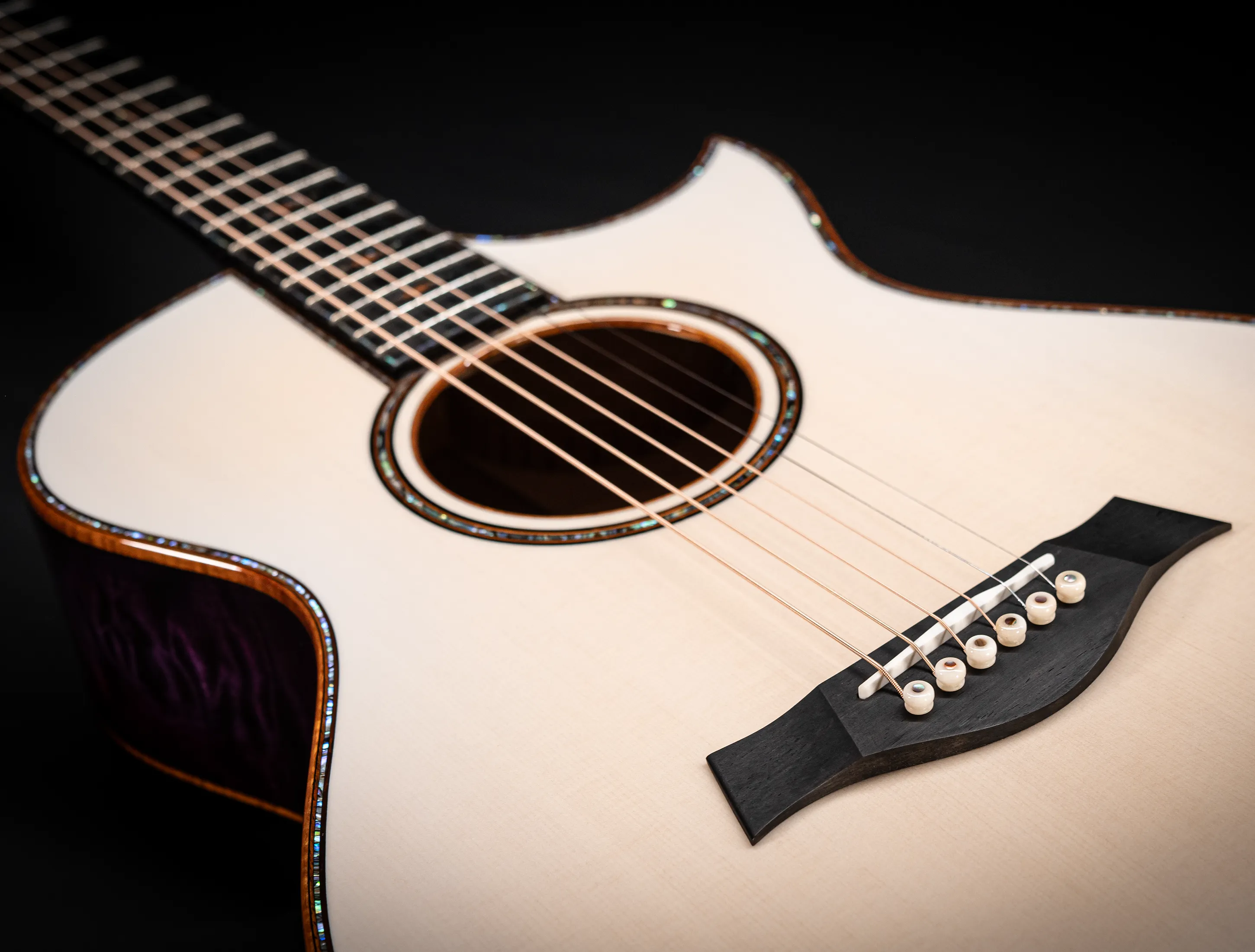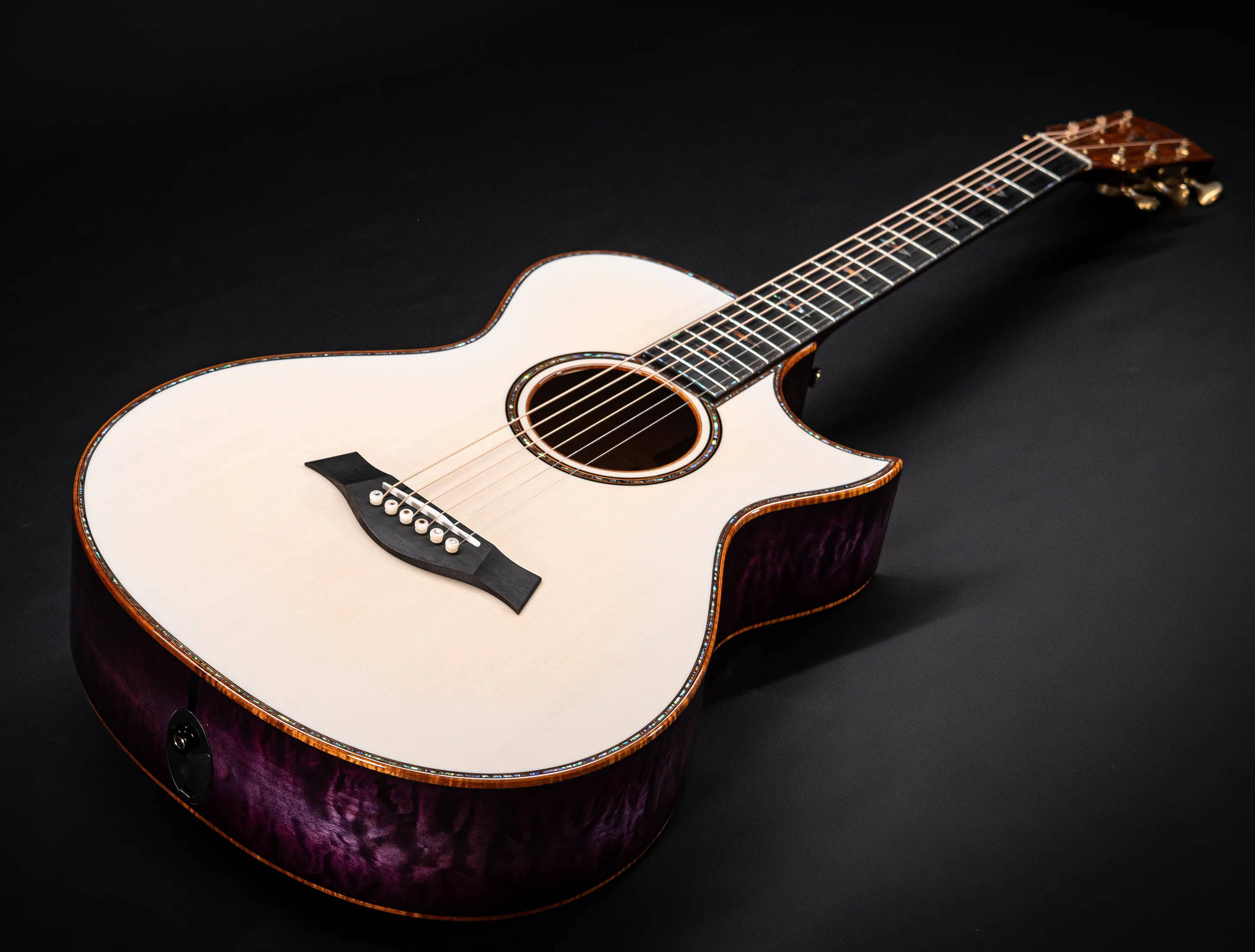Nur eine von 25 Modellen weltweit hergestellten Taylor Custom Dream dürfen wir Ihnen hier vorstellen. Sie ist nicht nur eine Gitarre, sondern ein Kunstwerk - Art meets Music. Denn sei vereint beste Handwerkskunst mit den musikalischen Höchstansprüchen von Taylor. Die mit traditionellem Heißleim verleimte Innenverstrebung verstärkt den warmen Klang und die Fülle der Mitten. Zahlreiche Details aus hawaiianischem Koa- und Paua-Holz sind zu finden, darunter das optisch raffiniert gestaltete hawaiianische Koa im vierteiligen Ahornboden. Weitere Highlights sind neben der transparten weissen Decke und dem lila schimmernden Korpus eine Einfassung aus gemasertem Koa, eine Century-Einlage auf der Kopfplatte aus Paua, Griffbretteinlagen in Form von ovalen Paua und Koa, eine mit Koa-Holz verzierte Paua-Rosette sowie Paua-Zierleisten für Decke, Griffbrett und Kopfplatte.