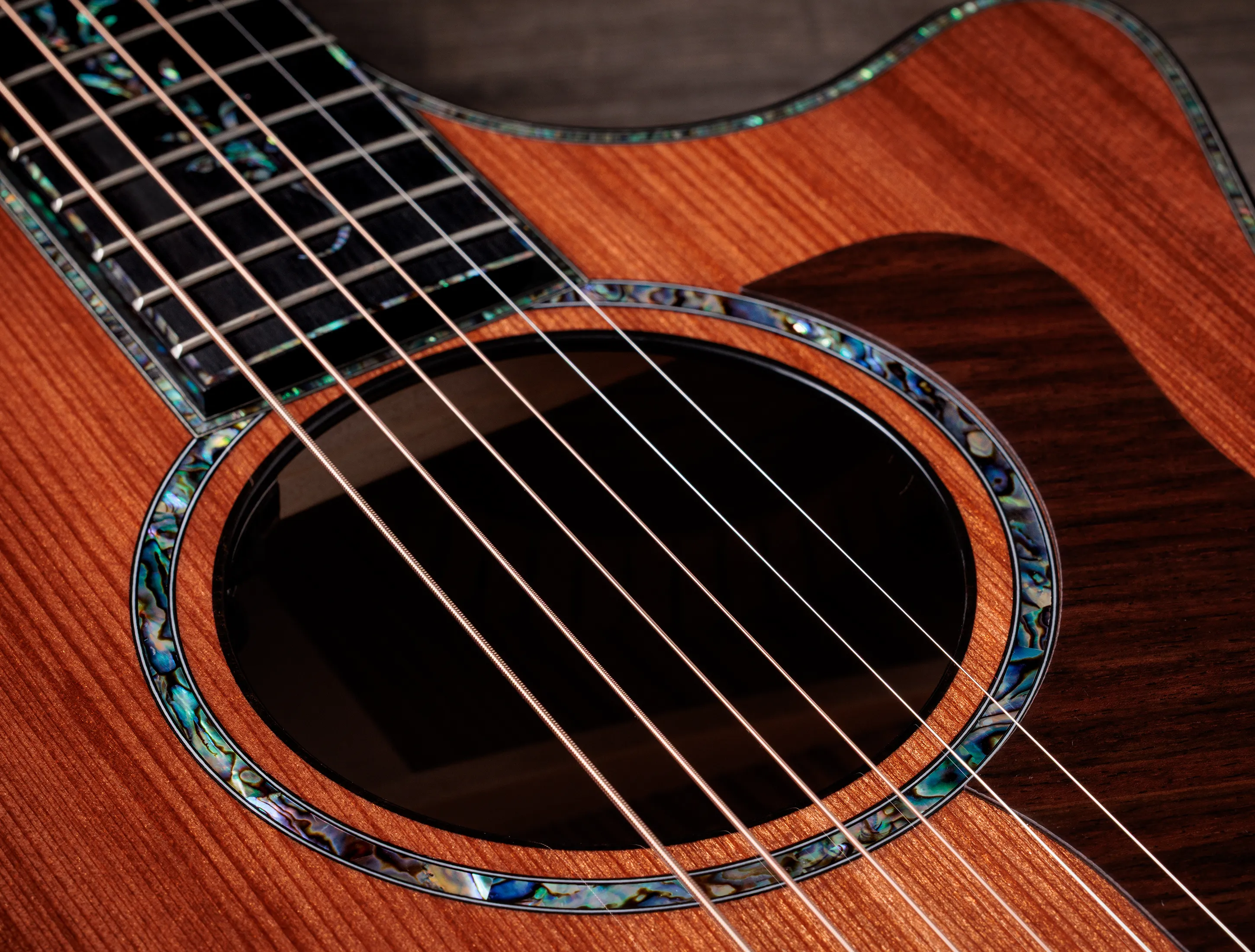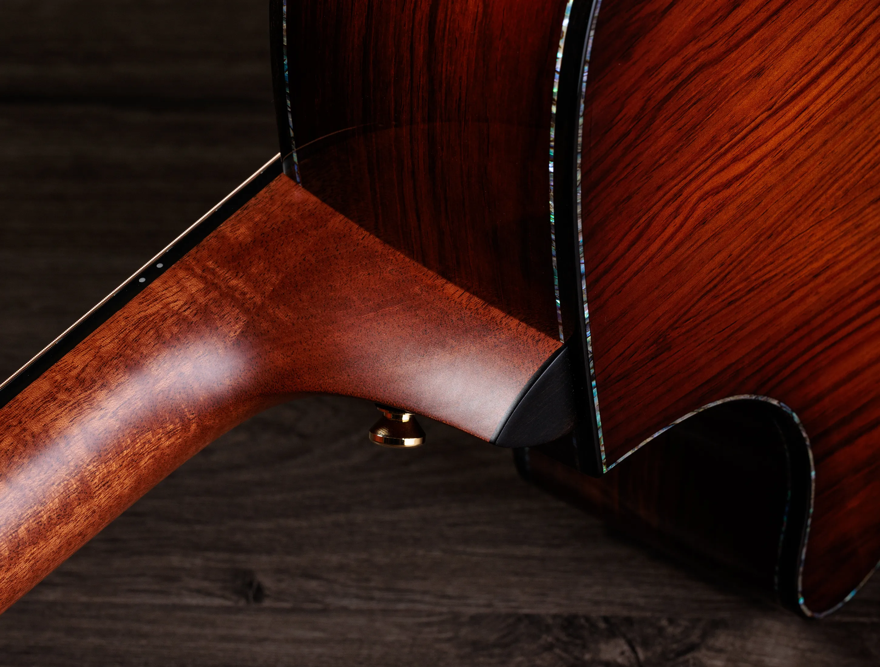 Höchste Aufmerksamkeit für das Detail ist hier reine Selbstverständlichkeit. Dies beginnt beim erlesensten Honduras-Palisander für den Korpus, welcher eine wunderschöne, natürlich Maserung aufweist und sein - von Natur aus - niedriger Dämpfungsfaktor eine sehr strukturiertes, harmonische Klangbild mit üppigen schwingenden Obertönen verleiht. Mit seinen klaren Höhen und der Präsenz im Bassbereich passt die sanfte "Stimme" des honduranischen Palisanders perfekt zur Sinker Redwood-Decke der Presentation PS14ce. Selbstverständlich gehört eine geschwungene Armstütze (Radius-Armrest) aus Ebenholz - die Form und Funktion mit geschmeidiger Eleganz vereint - zu diesen besonderen Merkmalen dazu, während atemberaubendes Paua die Konturen der Gitarre umsäumt und bei jeder Bewegung funkelt. Die detailreich California Vine Intarsie umspielt das Griffbrett auf seiner ganzen Länge, mit zusätzlichen fein gearbeiteten Einlagen in Kopfplatte, dem Steg und auf dem Schlagbrett.
